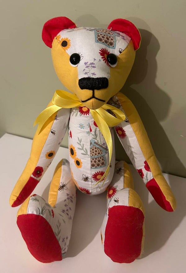 Handmade stuffed animal made from loved ones clothes. This is a great way to remember a special time such has a child's first year, a wedding or first school uniform or even a loved one who is no longer with us.